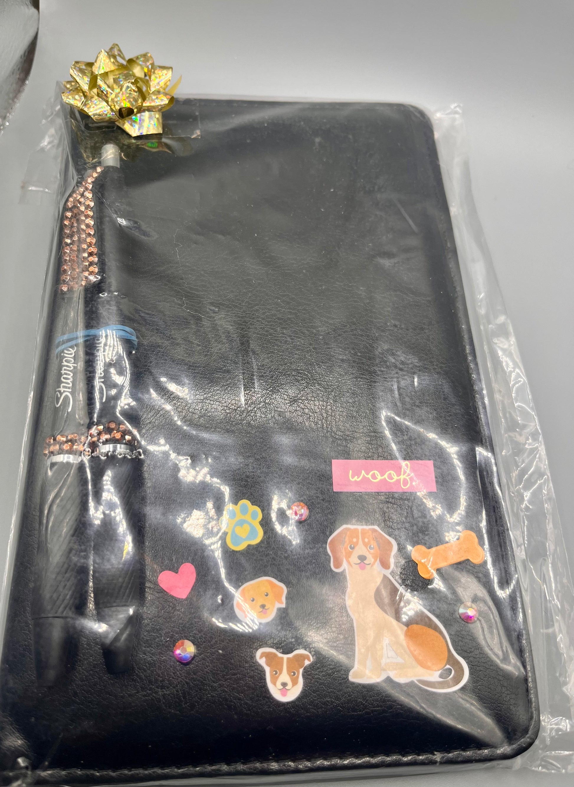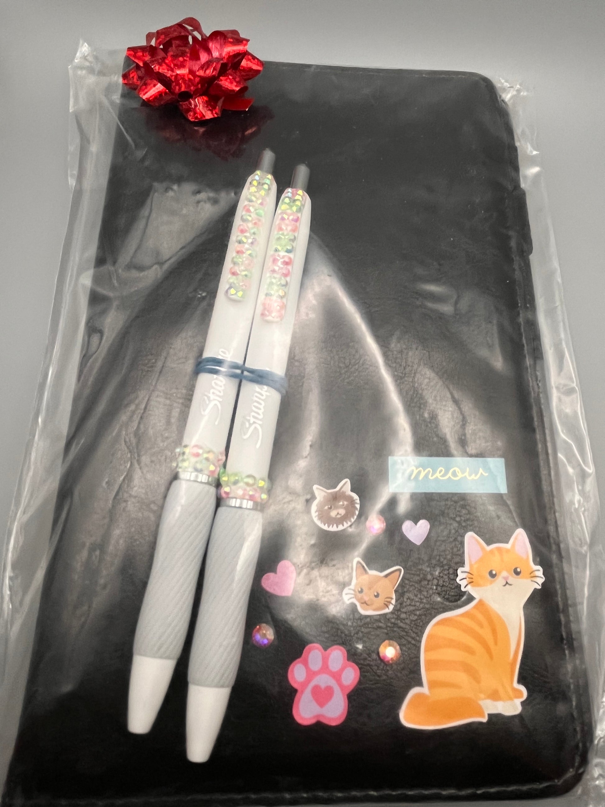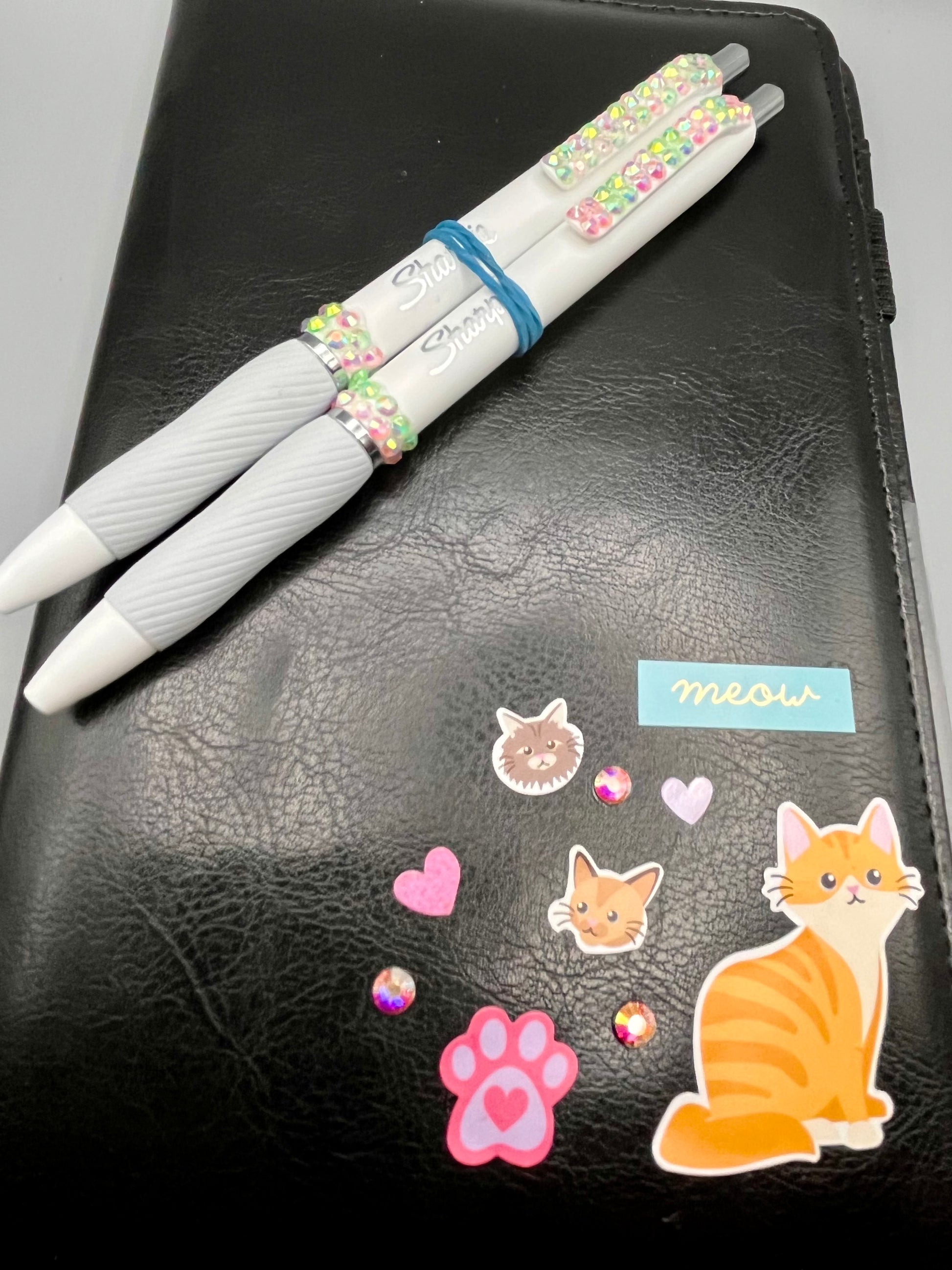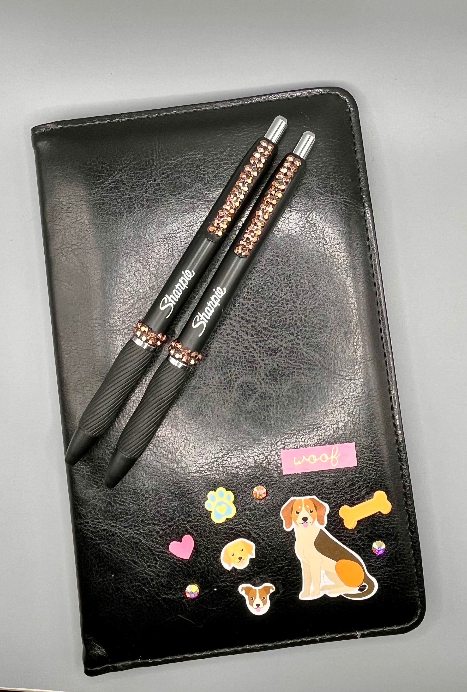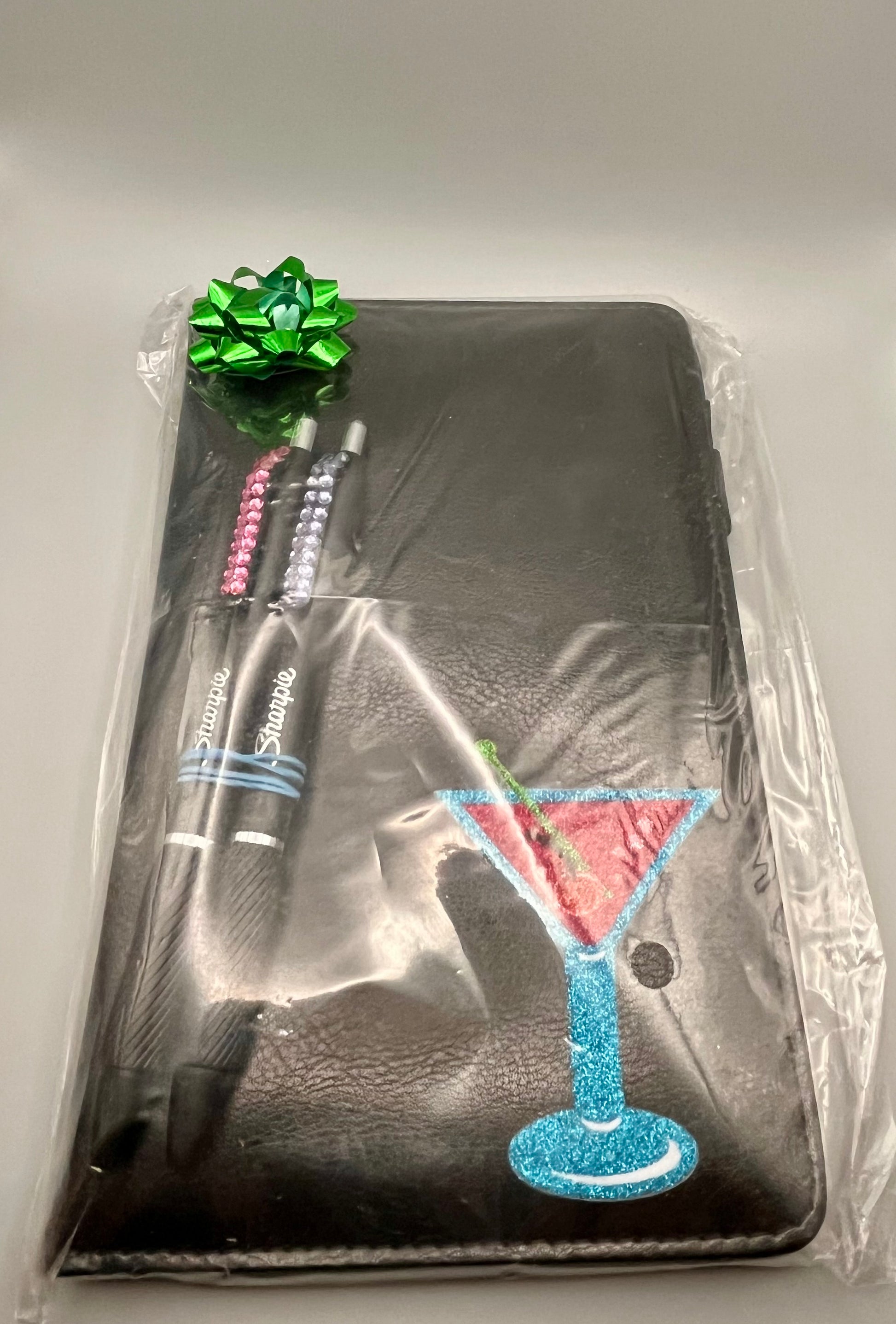 Cute and functional waiter/server book. Decorated with permanent images and/or embellishments in the front bottom corner. Perfectly discreet for more formal uniform standards with room to add your own “flair” as well. Approx 8”x5.5” Each book comes with two coordinating rhinestoned Sharpie gel pens.