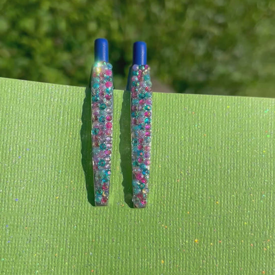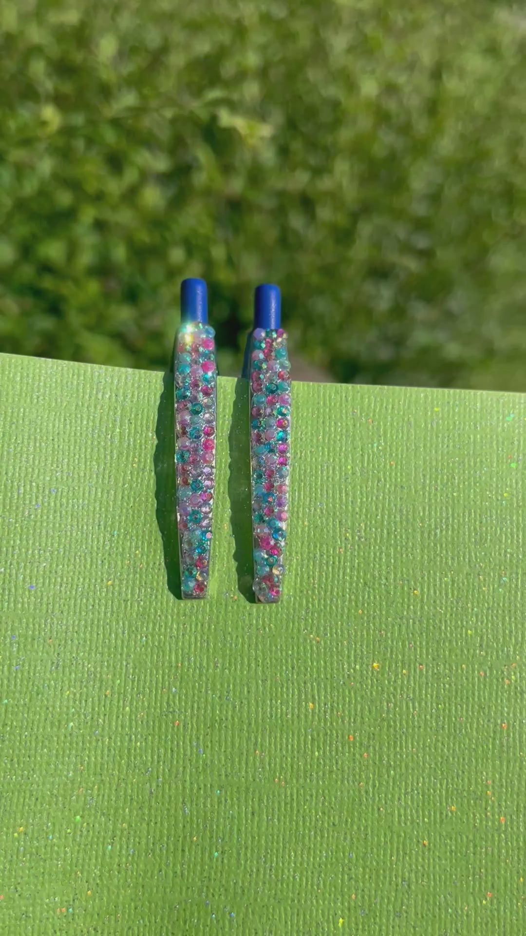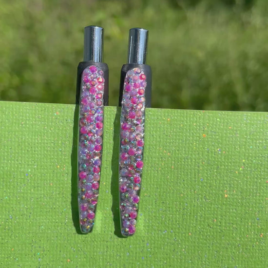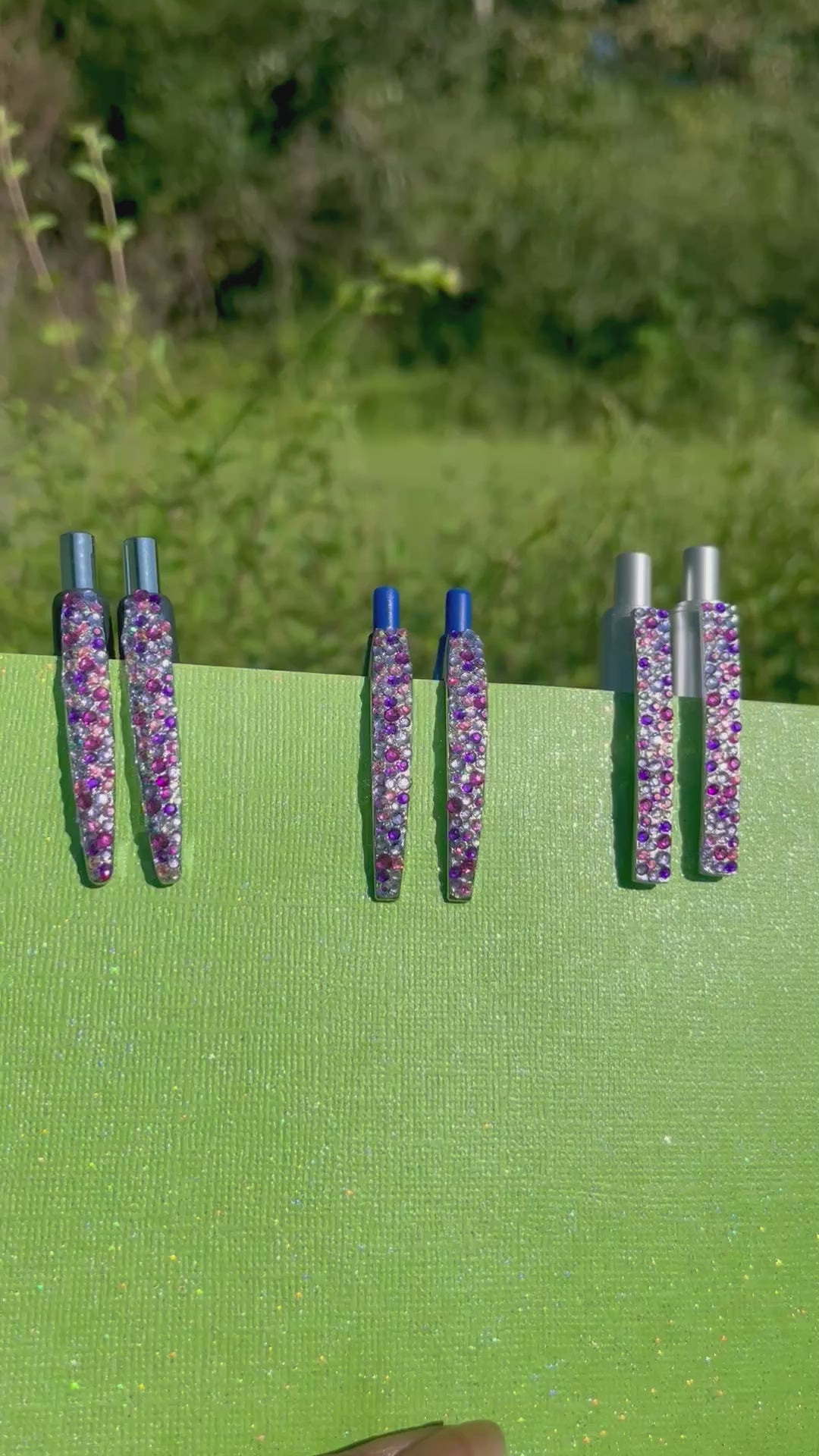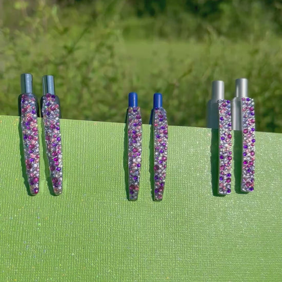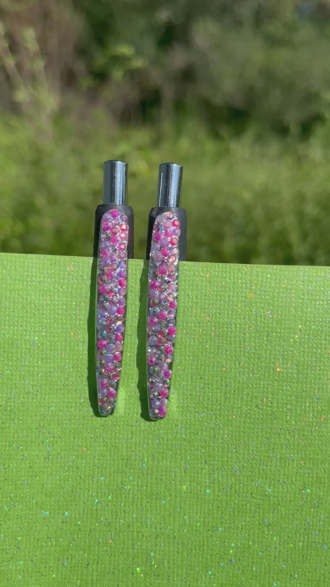 Beautiful hand glued rhinestones decorate the pen clip on your choice of pen type. Choose rhinestone color scheme, ink color and ballpoint or gel. Price is $5.00 for 2 pens. Photos are only examples of rhinestone scheme. These are individually hand made and schemes that do not have a pattern will all vary. Some variations may not be in stock and require 3-5 days of production before shipping. Pen brands and barrel colors will vary depending on variation.