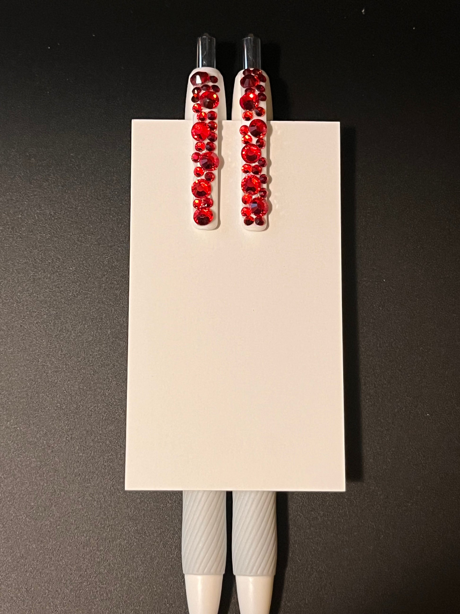 Two gel black ink pens with beautiful red rhinestones decorating the pen clip. Subtle but distinctive and unique. Eye catching and personalized for the office, restaurants, school or home!