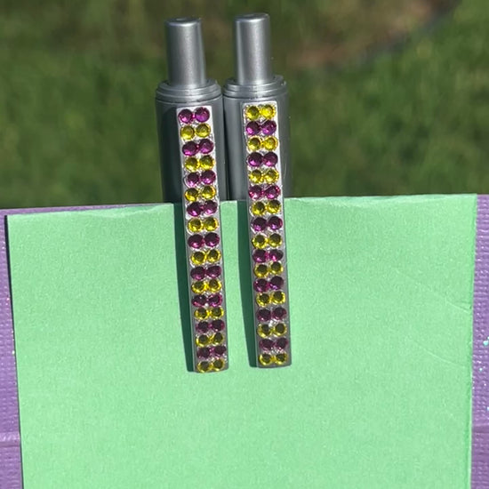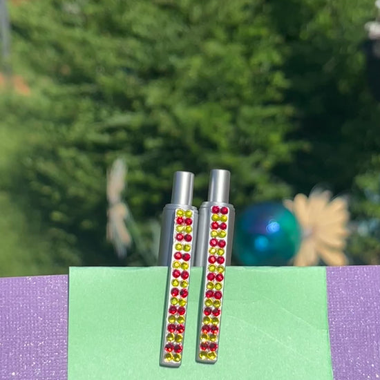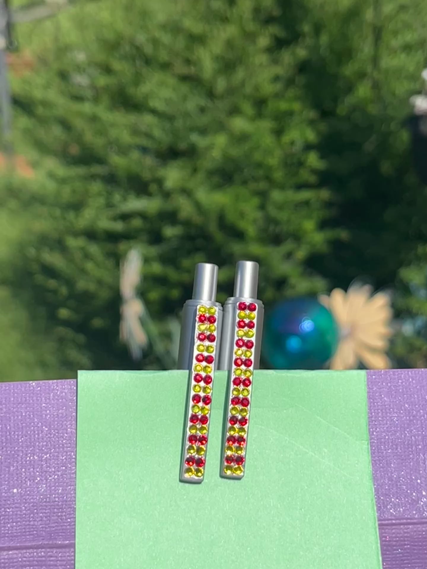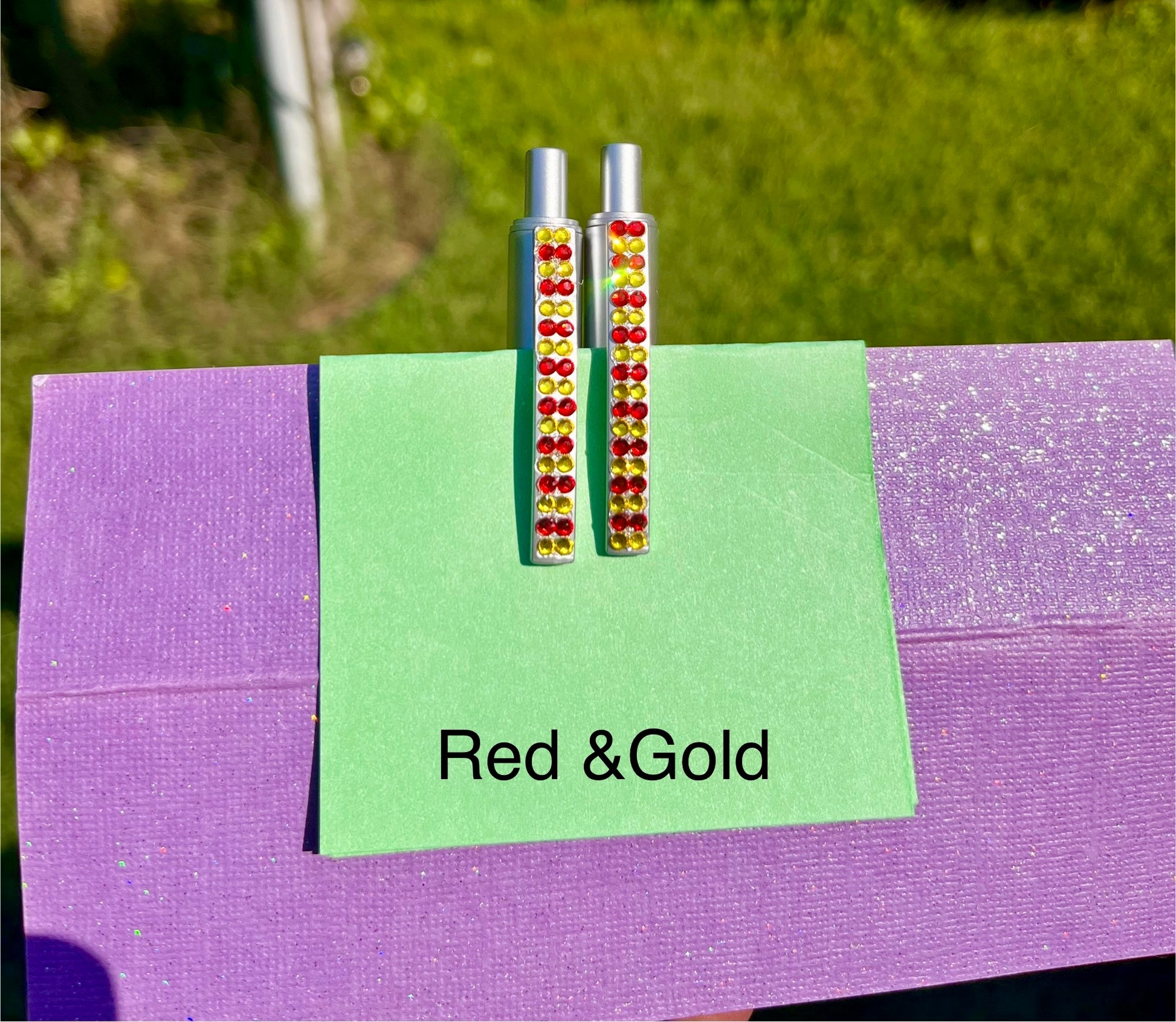 Beautiful hand glued rhinestones decorate the pen clip on your choice of pen type. Choose rhinestone color scheme, ink color and ballpoint or gel. Price is $5.00 for 2 pens. Photos are only examples of rhinestone scheme. These are individually hand made and schemes that do not have a pattern will all vary. Some variations may not be in stock and require 3-5 days of production before shipping. Pen brands and barrel colors will vary depending on variation.