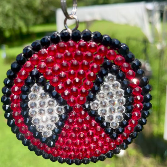 This ornament features a 3 1/2” round super hero emblem on an elastic black cord that hangs 8 1/2”. Made of plastic fused beads with hand glued sparkling rhinestones attached on both sides.