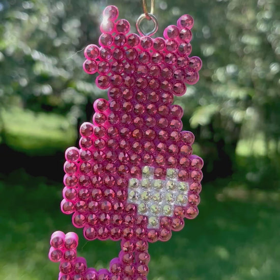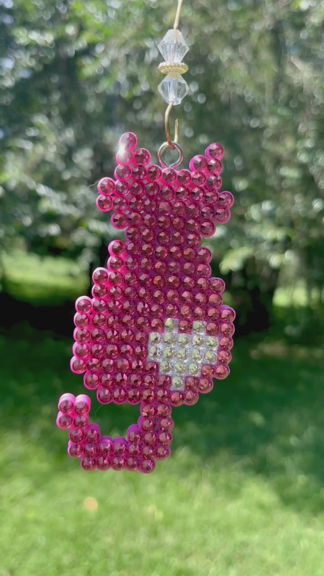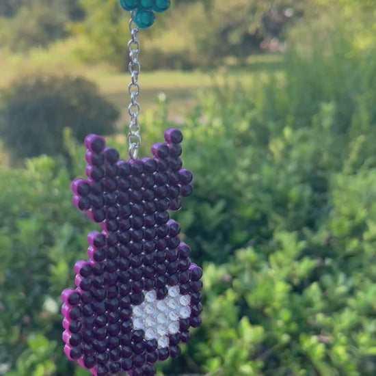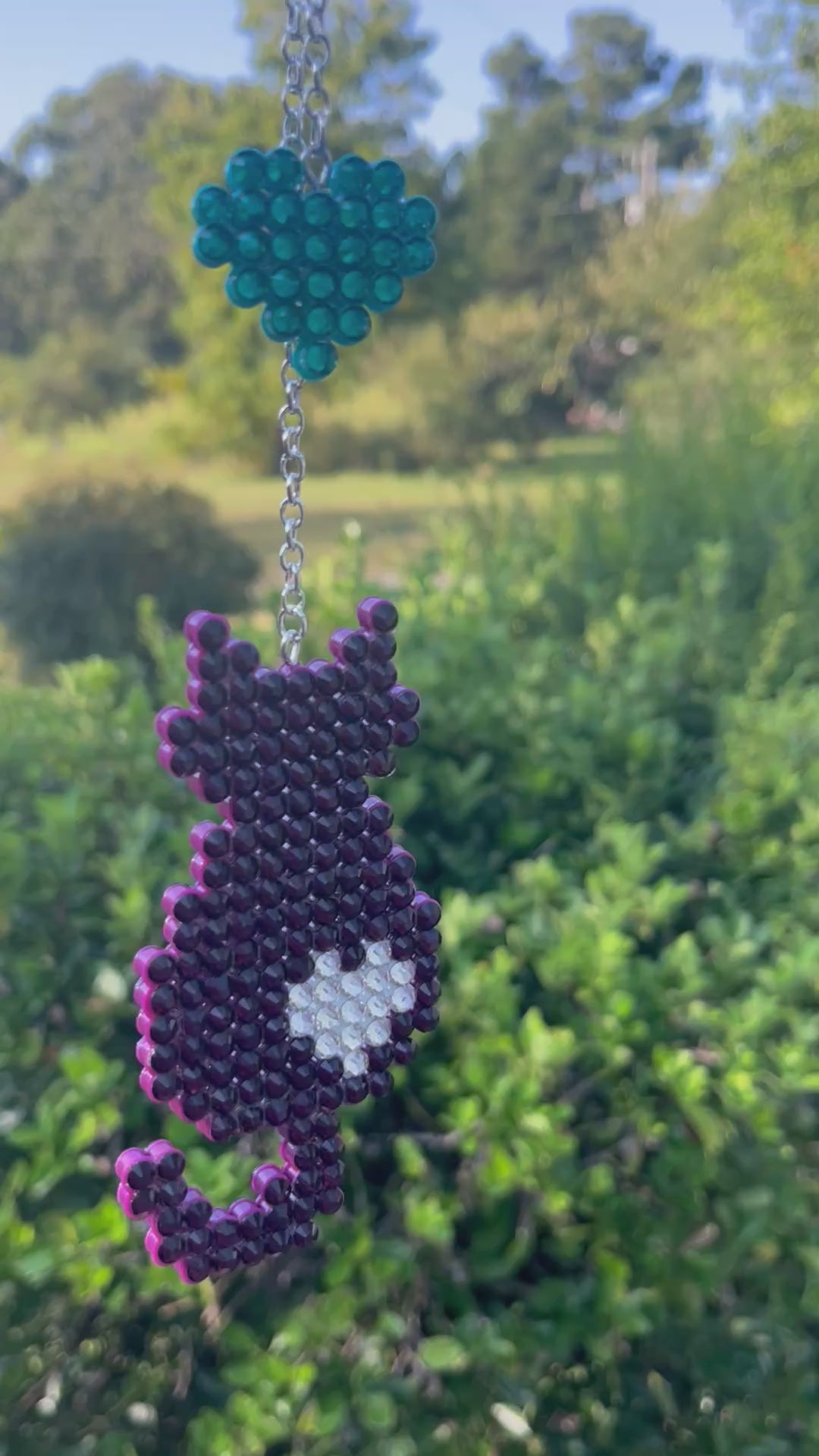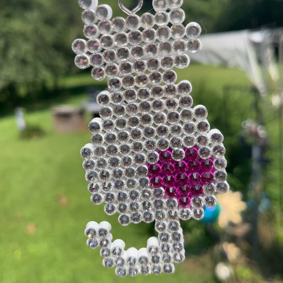 Adorned with a chain and elastic loop for hanging on a car rear view mirror but it’s beautiful anywhere there’s light and a hook! Choose a kitty base color and then choose a heart charm color to add to your kitty. Total length is approximately 14 1/2”. The kitty charm measures approximately 4 1/2” x 2 1/4”. Weighs approximately 1.3 oz.