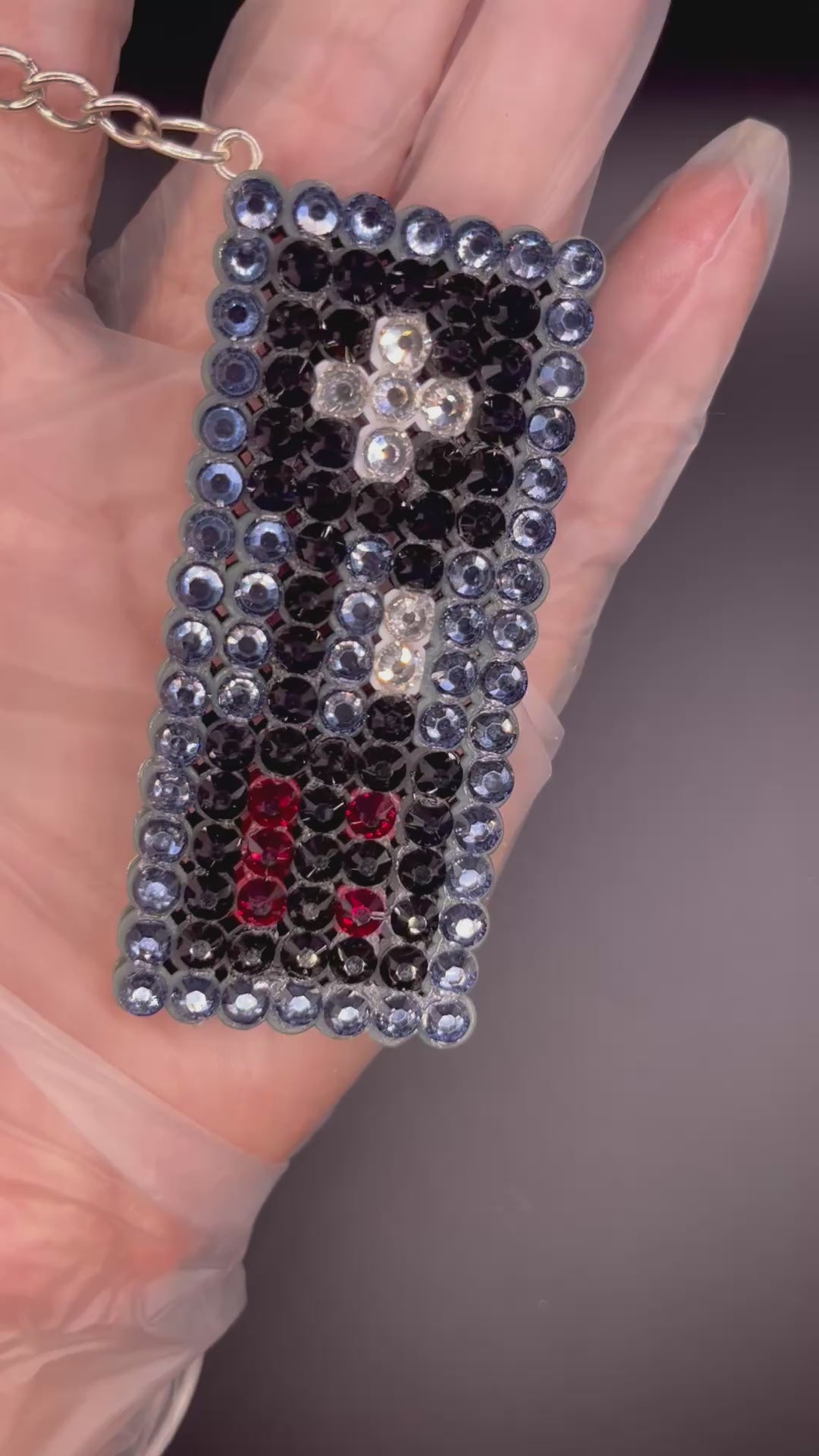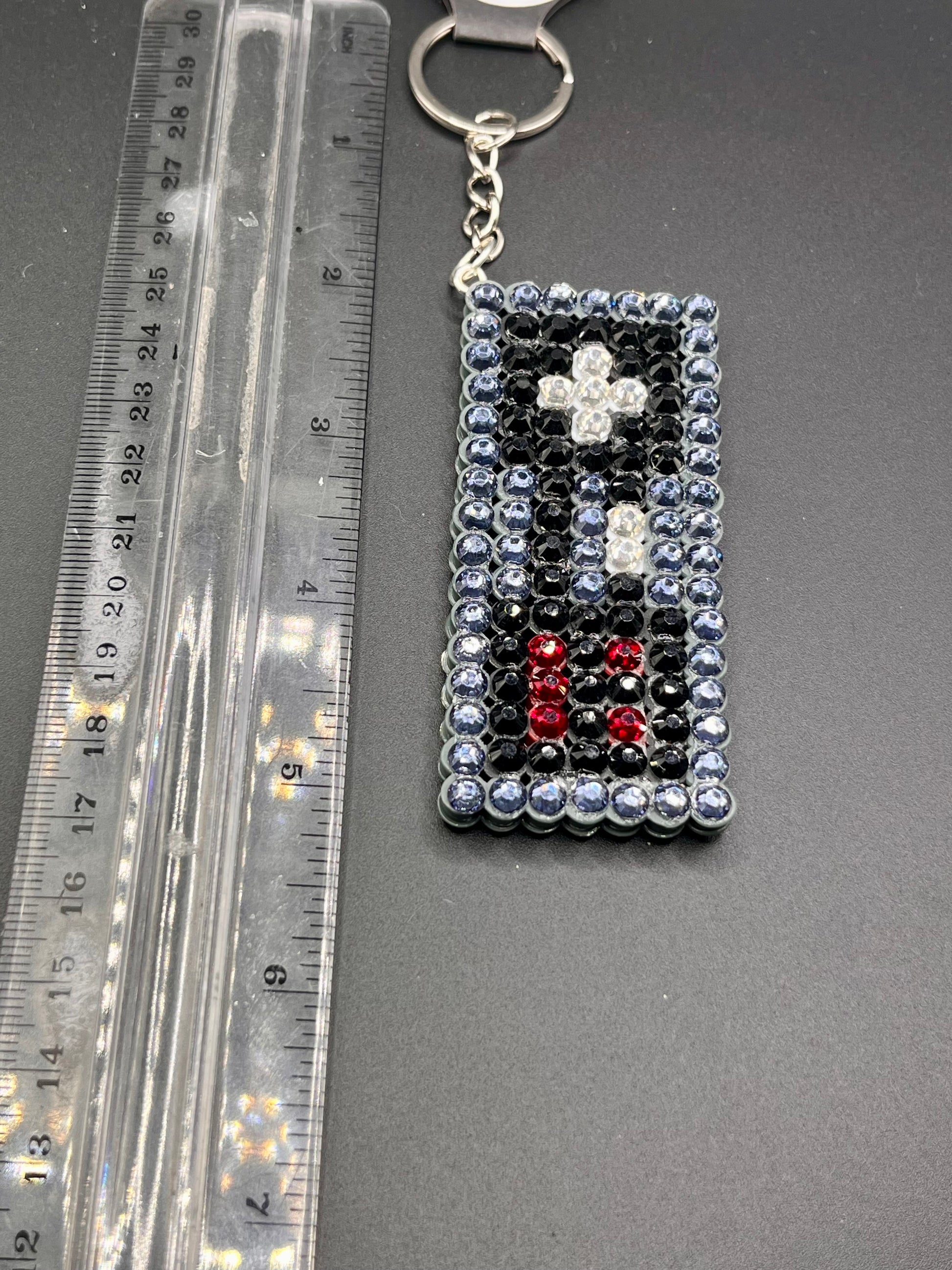 A unique and fun keychain featuring a Nintendo game controller charm. Made with fused plastic beads and sparkling glass rhinestones.