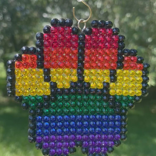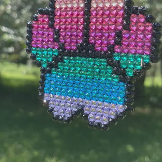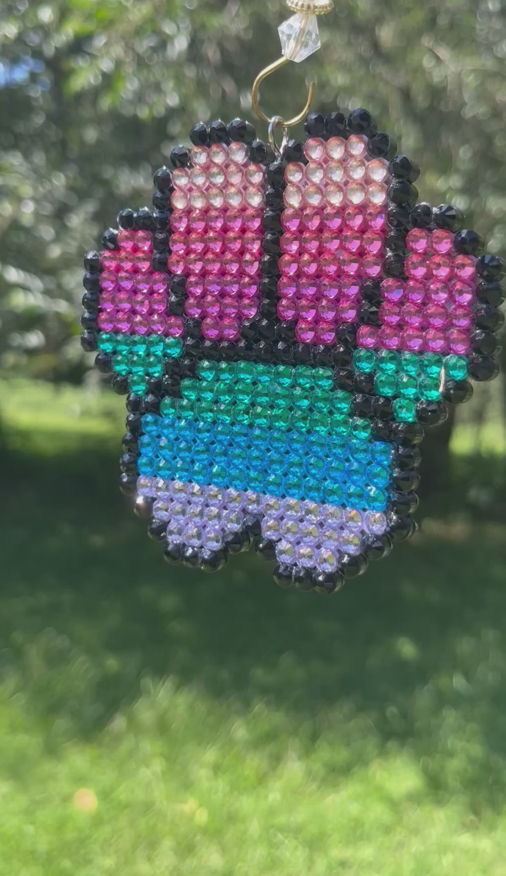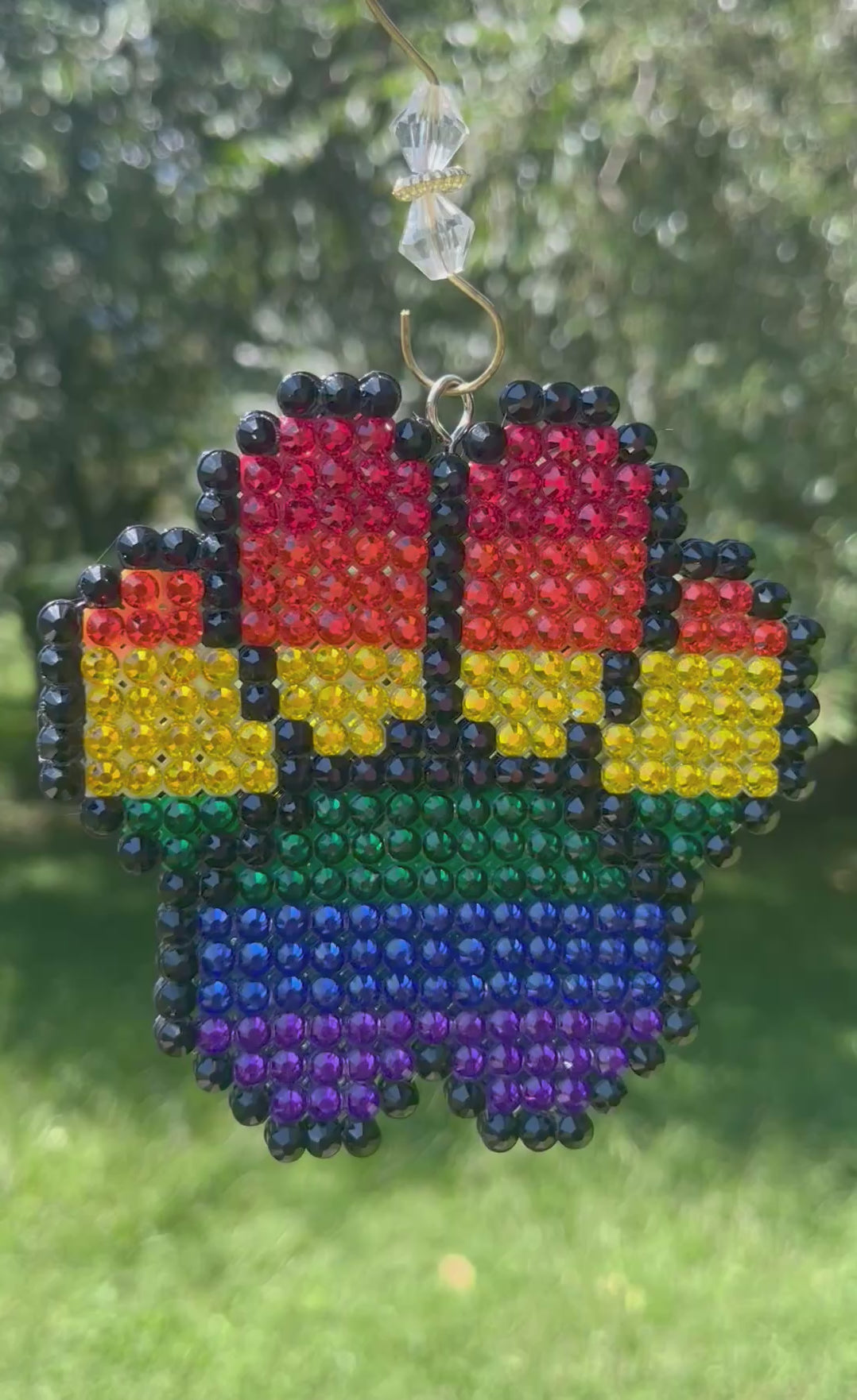 This ornament features an approx 41/4” X 4” paw made from sparkling rainbow colored rhinestones. It hangs in total approx. 12”. Choose from a white ribbon, rainbow elastic, or chain style (additional charge)to hang your beautiful piece. Weighs just over 2oz.