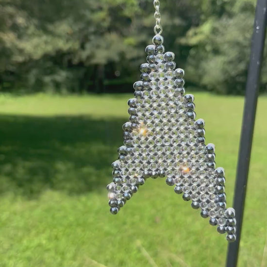 This ornament hangs approximately 12” with a gorgeous 5”x3.25” silver communication badge from a popular sci fi series. Hangs from a 7” silver colored jewelry chain and split ring ready for any hook in your home! Weighs approximately 1.3oz.
